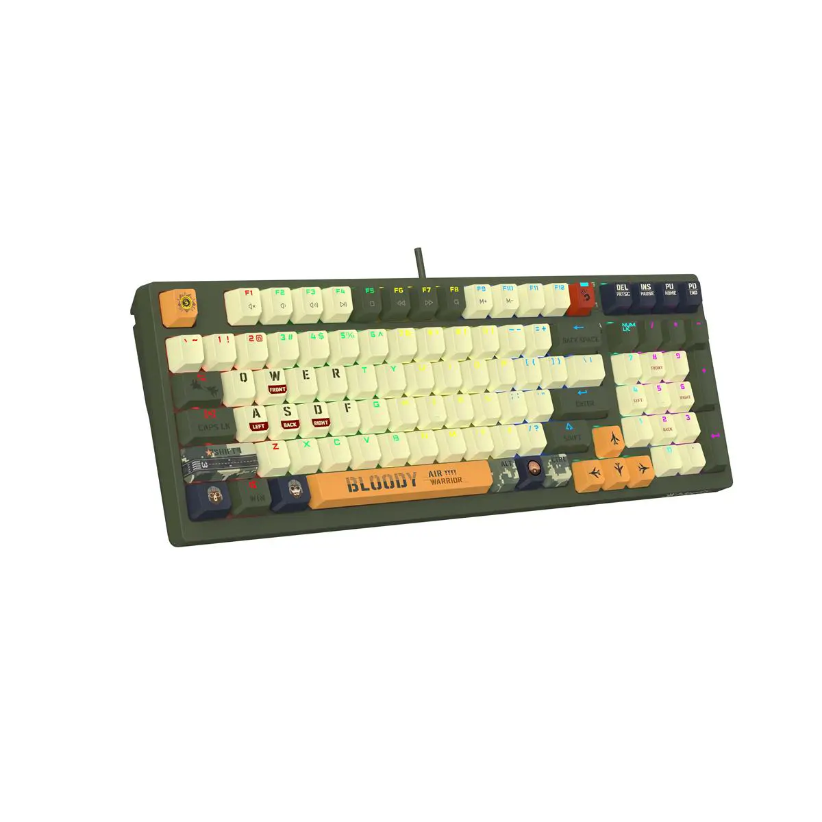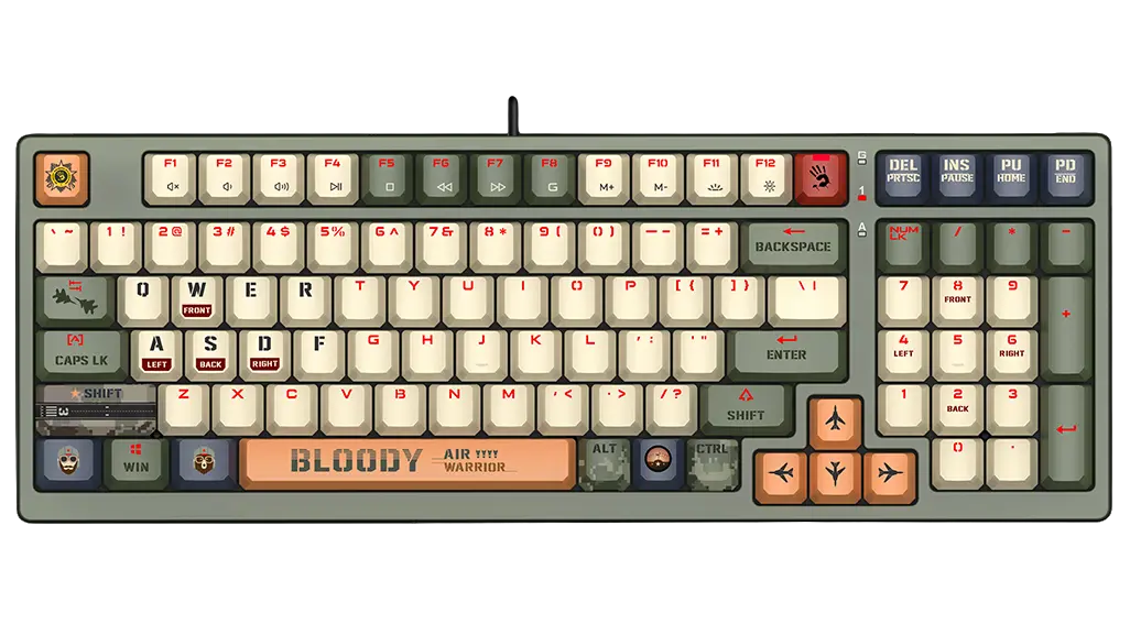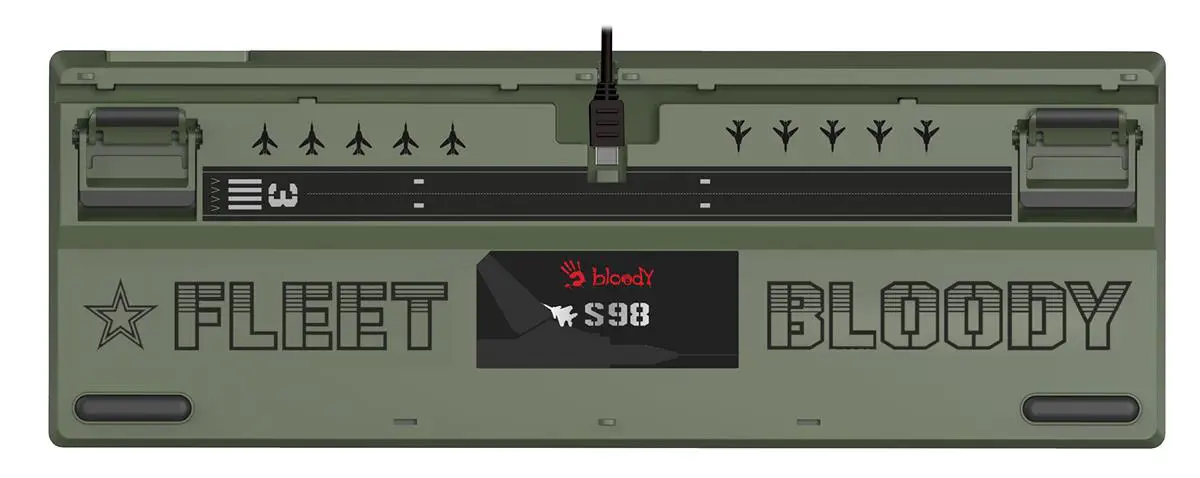 A4Tech Bloody S98 Aviator with "military" colors is designed for fans of computer games. At its core are BLMS mechanical linear switches with adjustable actuation point and force that respond quickly and accurately to pressures. This model features a compact layout with a number pad and RGB LED backlighting for added style. Stable signal transmission in A4Tech Bloody S98 Aviator is provided through a wired USB interface.